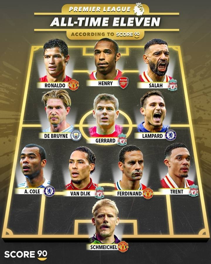 北京时间8月23日消息,Score 90评选了英超历史最佳阵,利物浦四人入选,曼联三将在列。Score 90评英超历史最佳阵:门将:舒梅切尔(曼联)后卫:阿什利-科尔(切尔西)、范迪克(利物浦)、费迪南德(曼联)、阿诺德(利物浦)中场:德布劳内(曼城)、杰拉德(利物浦)、兰帕德(切尔西)前锋:C罗(曼联)、亨利(阿森纳)、萨拉赫(利物浦)